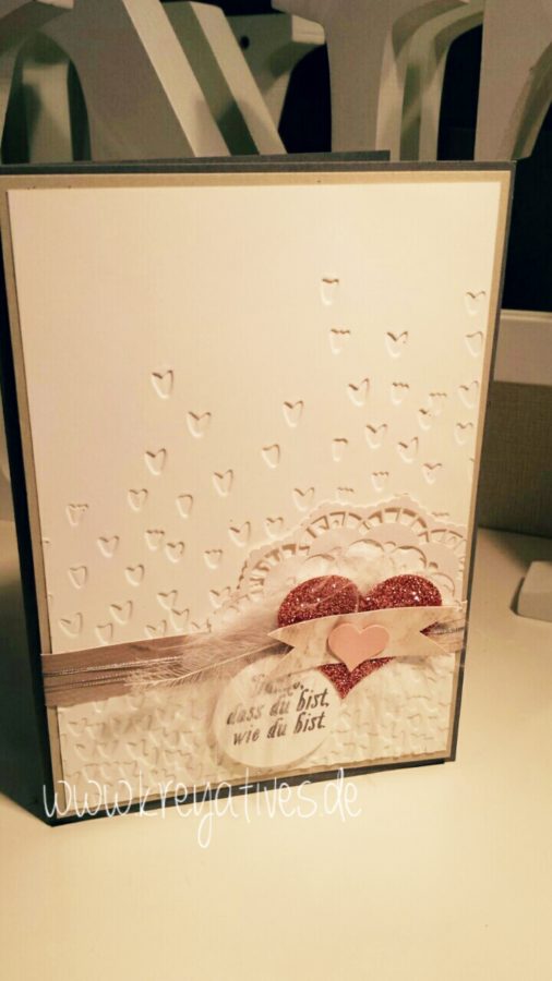 Heute gibt's von mir noch einmal eine Idee mit der Prägeform "Blütenregen". Ich sehe aber eigentlich nicht nur Blütenblätter darin, sondern für mich sind da auch kleine Herzen, die da geprägt werden. Was meint Ihr? Die erhabene Seite habe ich nach "hinten" gelegt. Der Effekt der Prägung ist ebenso schön wie anders herum. Als Kartengrund habe ich anthrazit und saharasand verwendet, ein neutraler Grund und perfekt ... Read the post