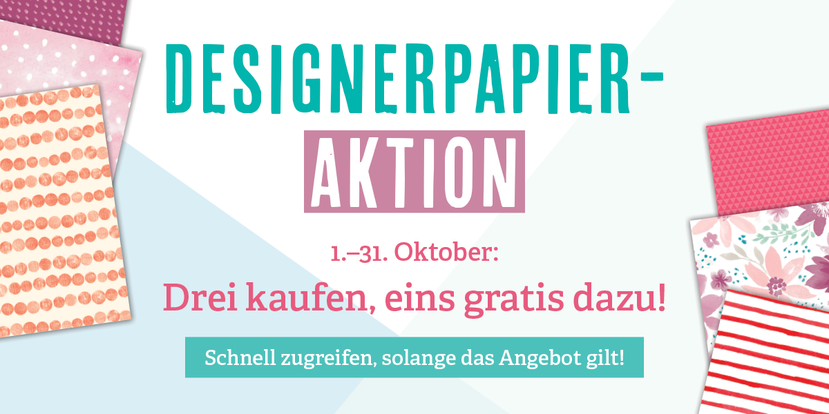 Ein schönes Angebot gibt es im Oktober von Stampin' Up! Beim Kauf von drei Paketen Designerpapier gibt es den ganzen Monat lang ein Pakte gratis dazu. Eine prima Gelegenheit, um Eure Vorräte aufzufüllen oder für die Weihnachtsbastelprojekte einzukaufen. Klickt einfach auf das Bild oder hier, und Ihr könnt alle Papiere sehen, für die dieses Angebot gilt. Wenn Ihr eine Bestellung aufgeben möchtet, schreibt ... Read the post